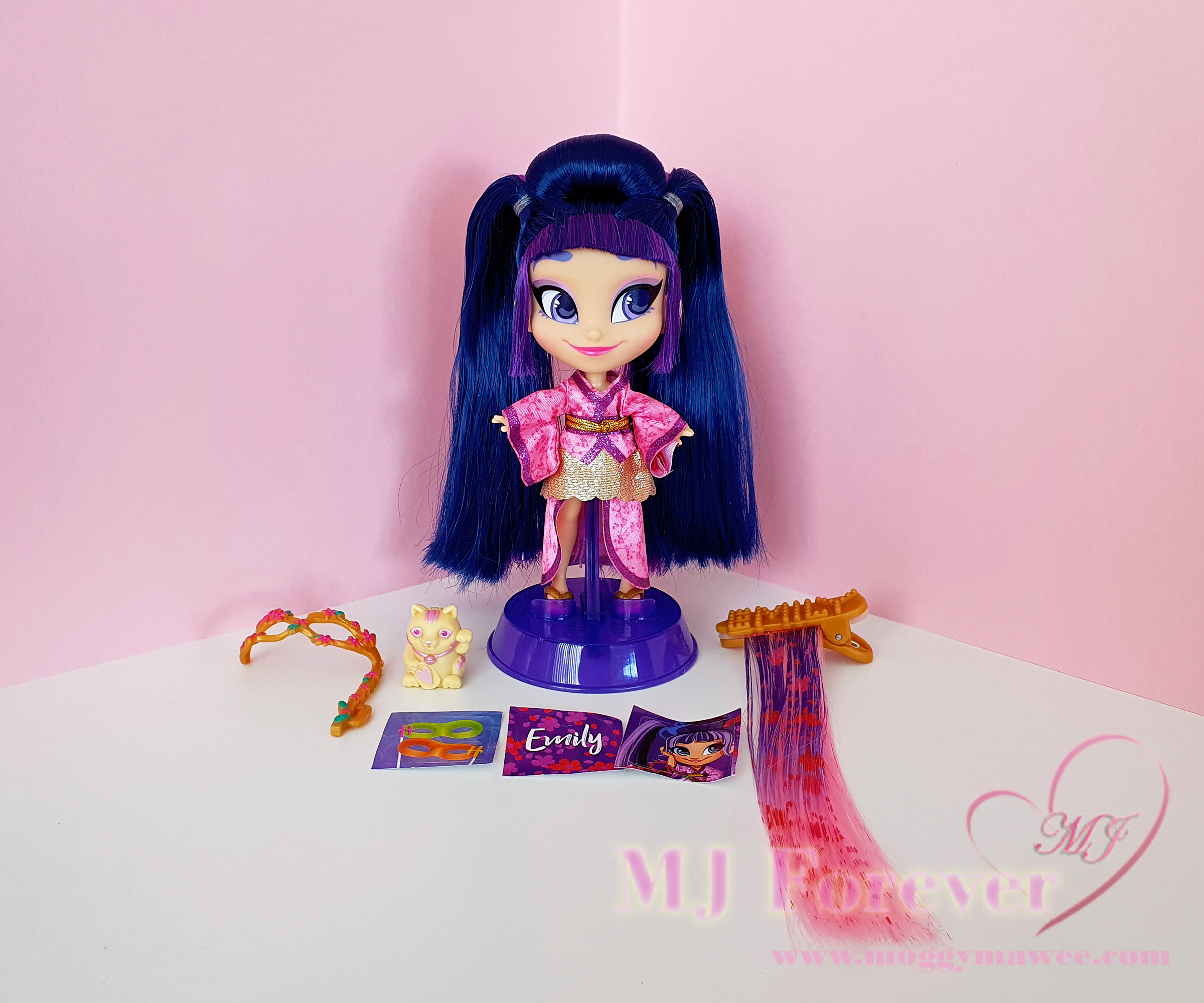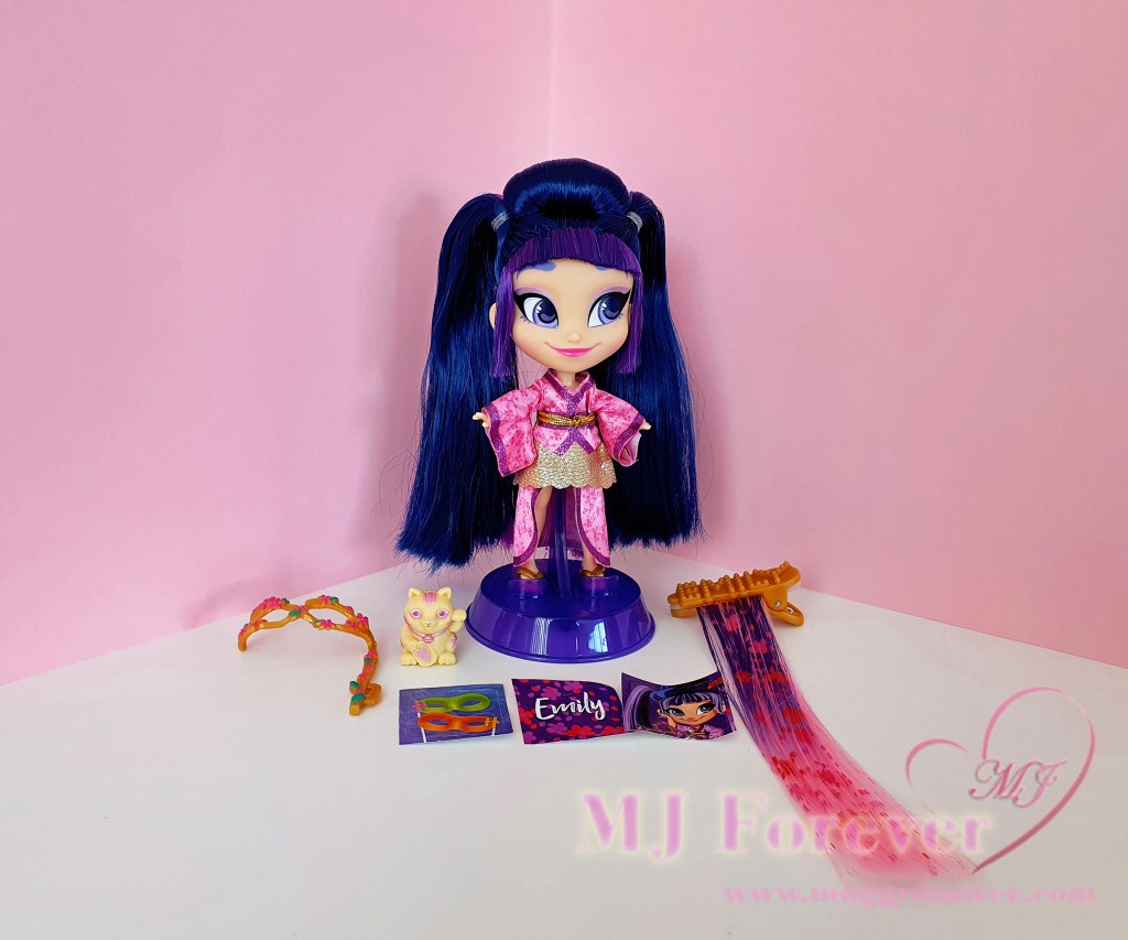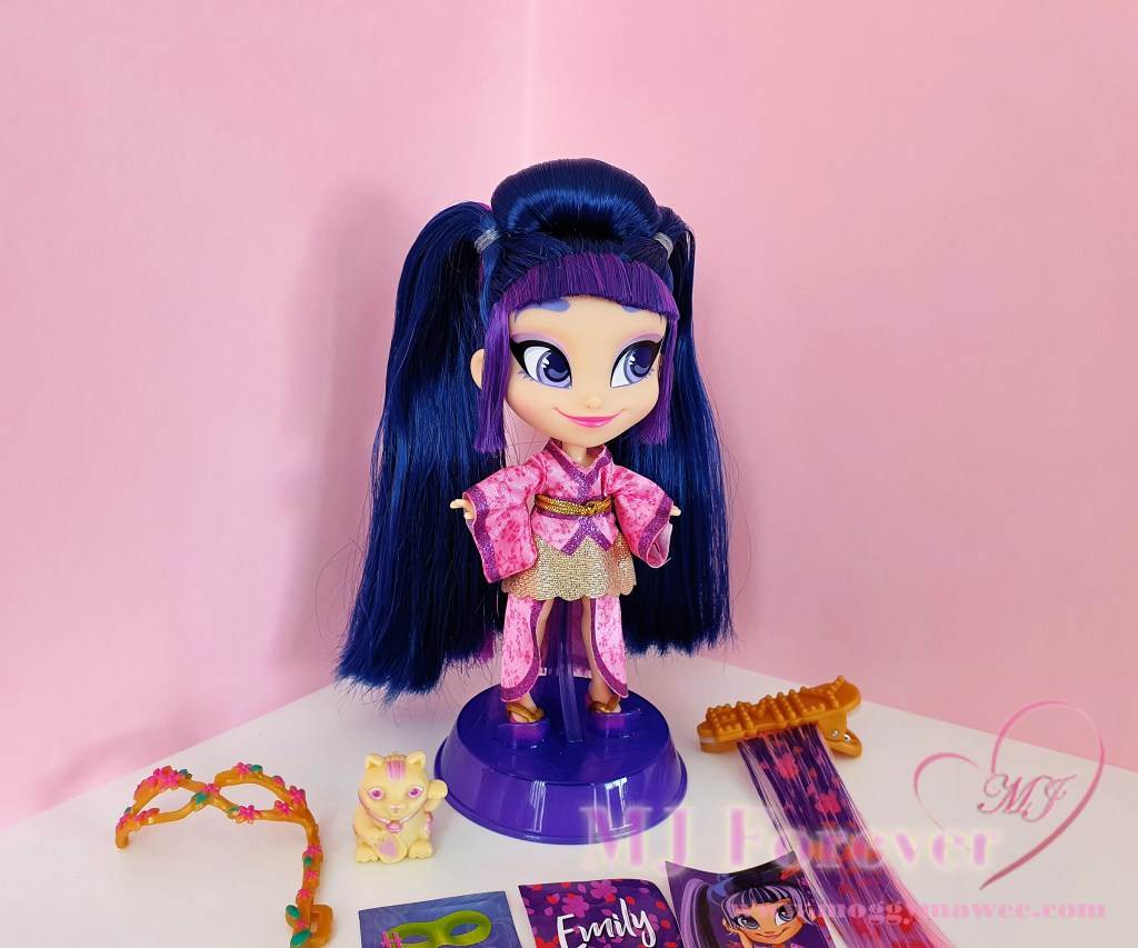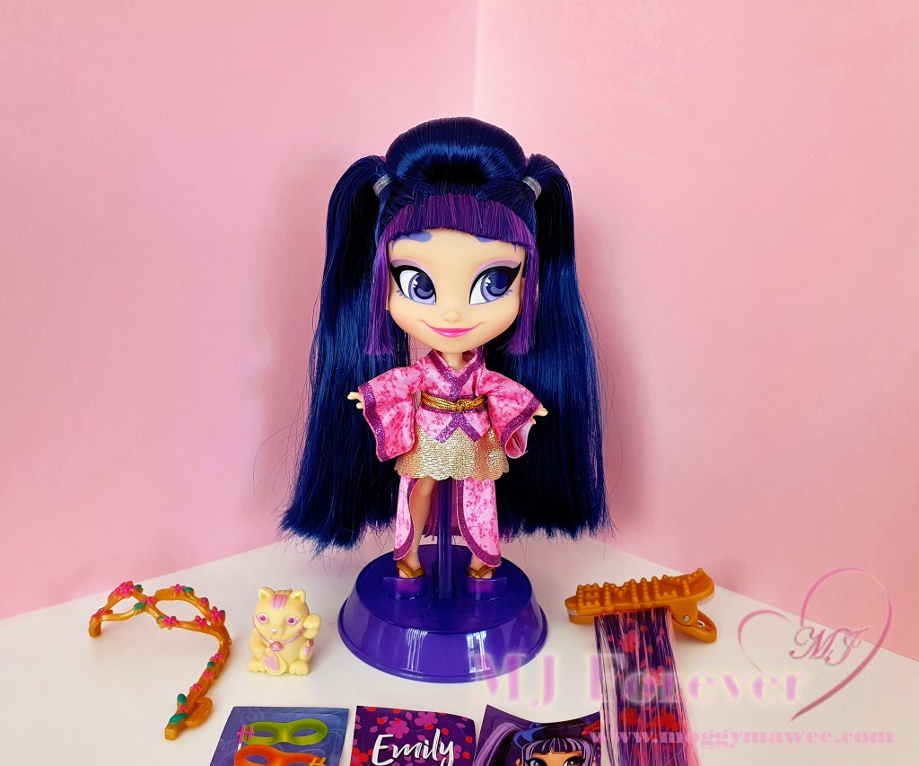 Now last, but definitely not least, I took the plunge and bought So Lucky Emily! She’s the Series 5 rare, and I got her from Idlefish. The pricing for her there is a lot fairer than on other marketplaces like Ebay (albeit still rather expensive).Β It goes without saying, she’s my all time Hairdorables grail and I love her to bits!Β As I’d previously mentioned, pink looks absolutely gorgeous on Emily, and her elegant sakura pink and metallic gold Kimono certainly showcases this.Β And together with her intricate japanesque up-do, bold winged almond eyes, delicate powder pink eyeshadow and beautiful blushing smile, she is a literal work of art!Β And now that I’ve seen her in person, I’m obsessed!Β I need more of her for my collection! So I’m in the midst of ordering two more from Idlefish.